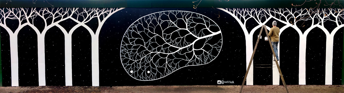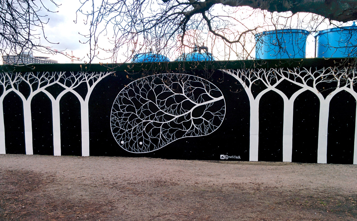 An indeterminable hovering shape flanked by two arched rows of trees. Branching structures folding into themselves. This mural is situated right next to the lakes right across the street from Øster Søgade 96, Østerbro, Copenhagen. Size: 18 x 4 meters.